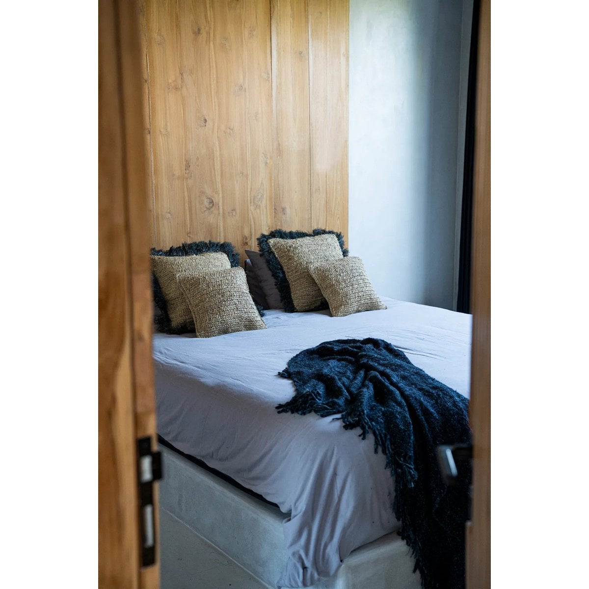 Die klare, quadratische Form in Kombination mit dem natürlichen Material macht „Bast Flores“ zu einem unaufdringlichen, aber charaktervollen Akzent auf Sofa, Bett oder Sessel.