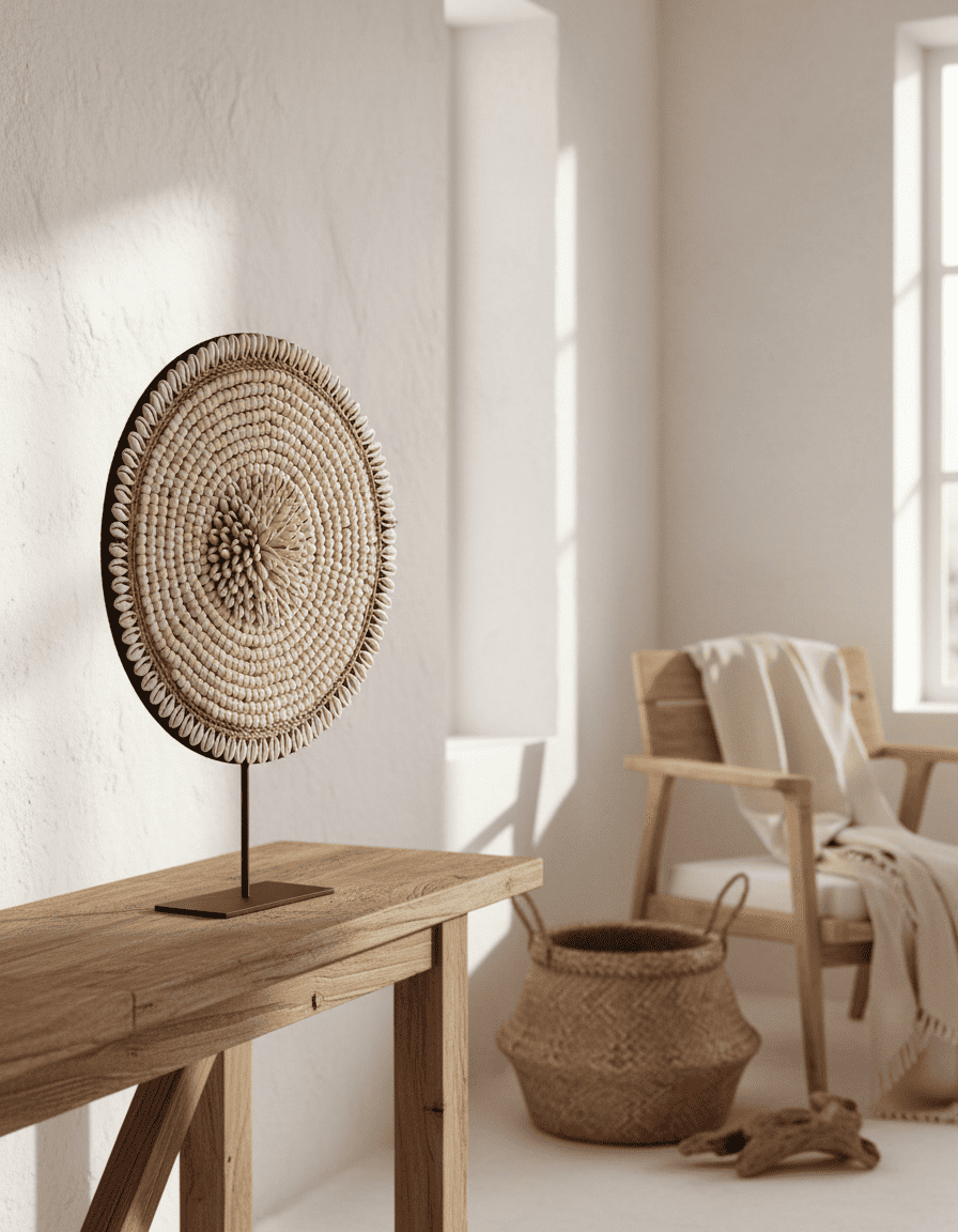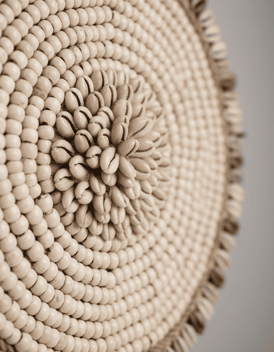 In feinster Handarbeit arrangierte Muscheln formen eine ruhige, fast meditative Kreisstruktur, die Natürlichkeit und Eleganz auf besondere Weise verbindet.