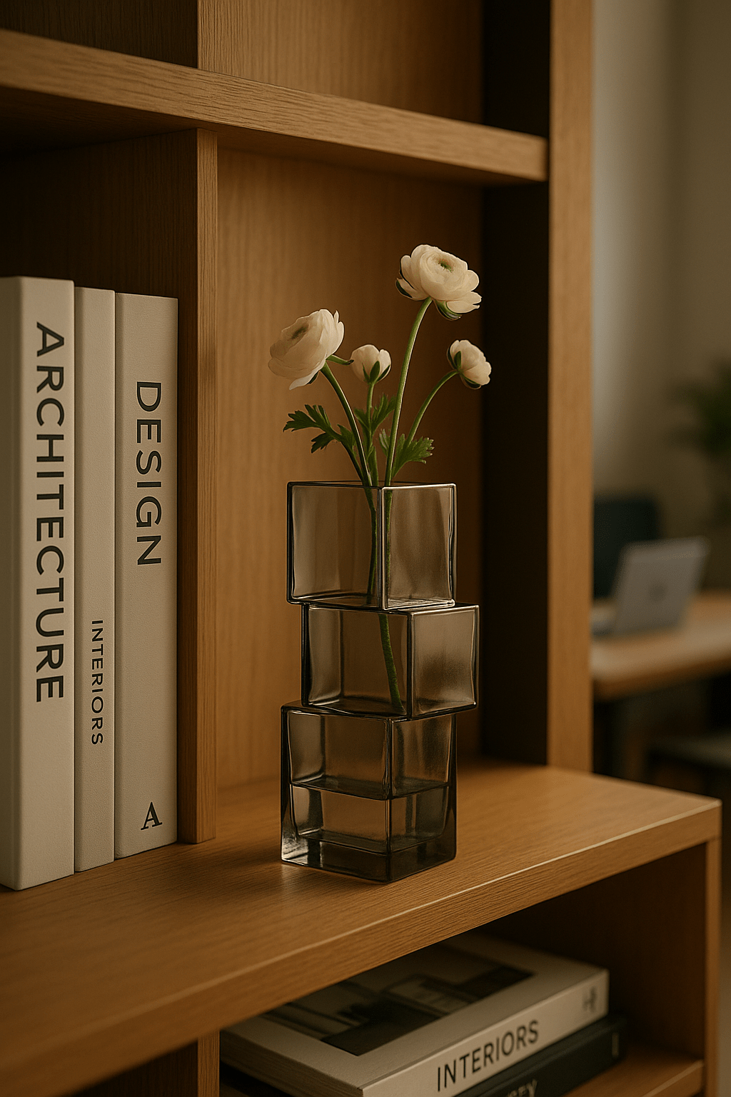 Die gestapelte Form erinnert an modulare Architektur und schafft Tiefe, ohne dominant zu sein. Dadurch fügt sich die Vase harmonisch in moderne, minimalistische und natürliche Wohnkonzepte ein – als Vase für einzelne Zweige oder als eigenständiges Designobjekt.