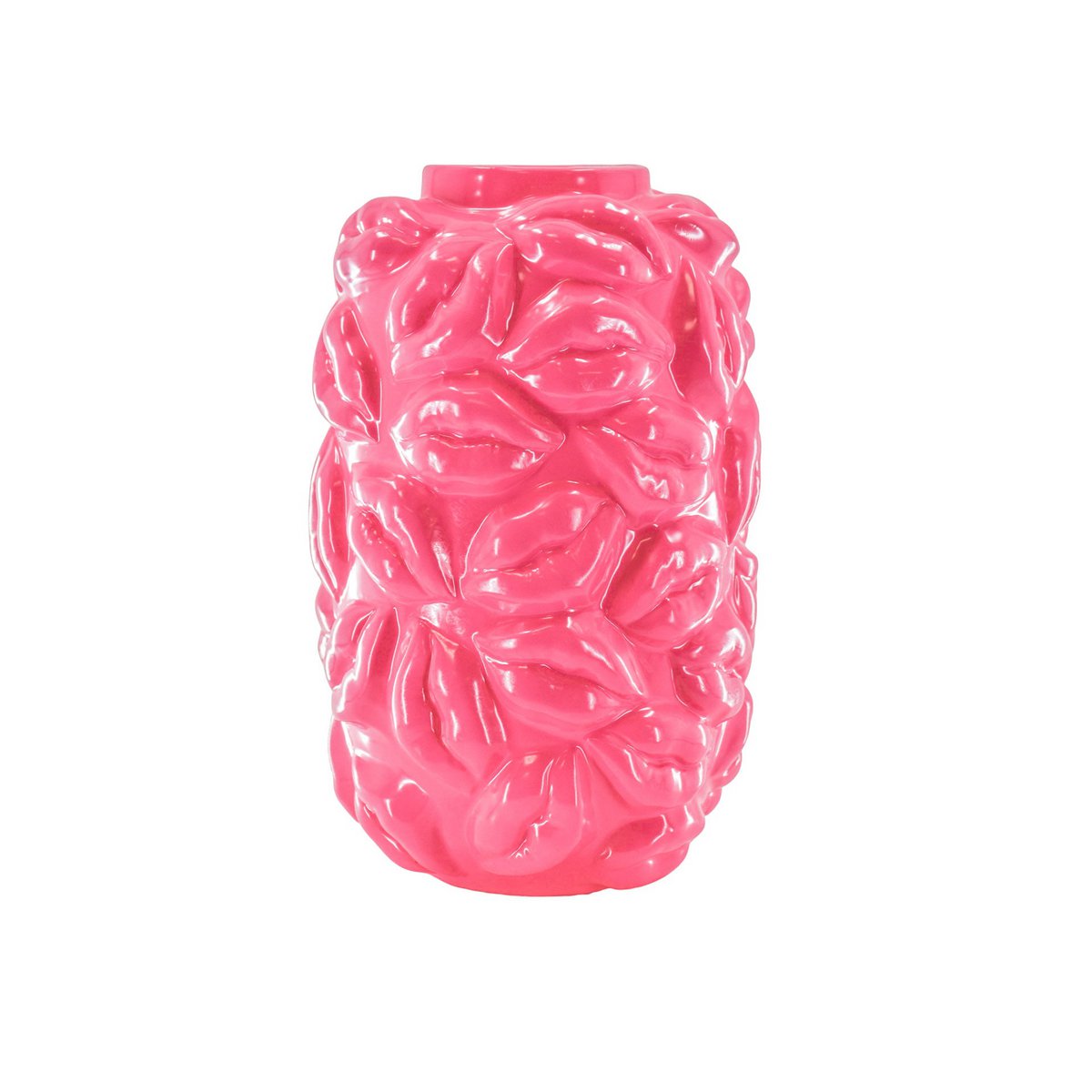 Die Vase Kisses Neonrosa ist eine ausdrucksstarke Keramikvase in leuchtendem Neonrosa. Die plastisch ausgearbeitete Lippenstruktur prägt die Oberfläche und verleiht dem Objekt eine klare, skulpturale Anmutung. Die Vase ist wasserdicht und für frische Blumen geeignet.
